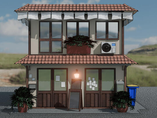 Bringing Sketch to 3D World!A cozy two-story Japanese-style bakery brought to life from a simple sketch. With red roof tiles, large wooden windows, and warm lighting, every detail — from potted plants to the outdoor AC — adds realism and charm, capturing the peaceful feel of a small-town Japanese bakery.